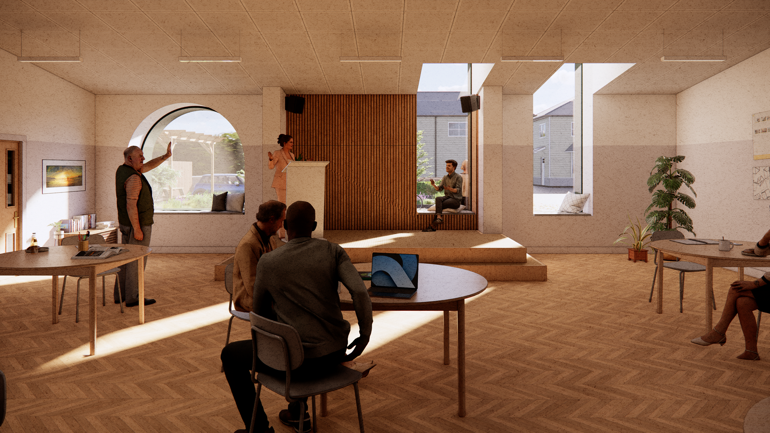 Internally, the layout has been reorganised around flexible, multi-use spaces: two halls, meeting and consultation rooms, a centrally located kitchen and bar servery, and accessible WC provision. Storage is integrated throughout to support a wide range of activities, from youth groups to community events. A new sun room / greenhouse extends the building into the landscape, providing a sheltered, year-round space for gardening and social use - building on the Hub’s long-standing relationship with its community garden.
