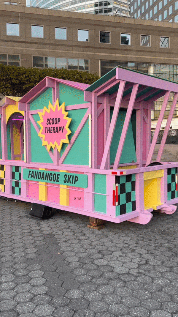 The stand-out kiosk will be made of sustainable materials in collaboration with CAUKIN Studio, a social enterprise that creates impact through architecture. The Fandangoe Skip *on tour* offers a brand-new space, reappropriating the American dumpster for ice cream and mental health. CAUKIN have designed and built an innovative community space which accommodates multiple offerings, workshops, and talks that make up the programme, curated by The Loss Project. The space allows for intimate group workshops and talks in a semiprivate environment, complete with atmospheric lighting and sound, with the backdrop of Brookfield Place and the World Trade Center.