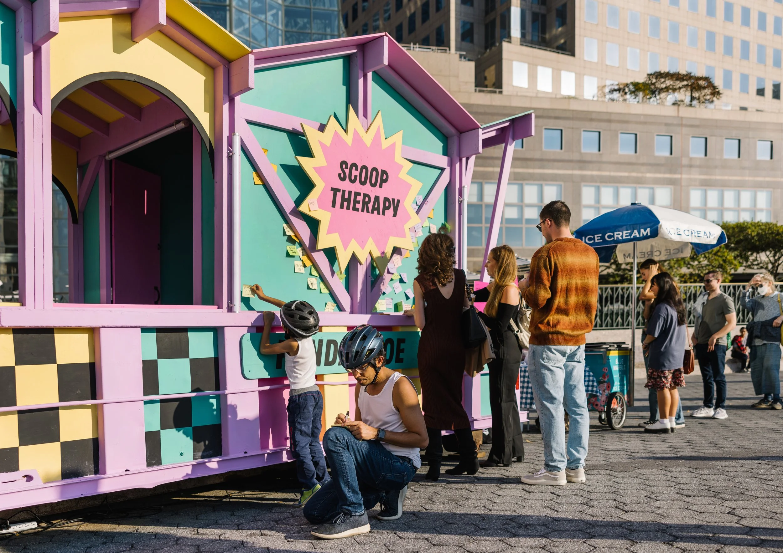 Project Brief: 1 in 4 of us will experience mental health challenges in our lifetime, something that has been significantly impacted by the global pandemic. Challenges with our mental health can feel incredibly isolating but in reality it’s something so many of us experience. The candy-coloured, ice-cream-kiosk-in-a-dumpster, first appearing in London during summer 2022 went on tour to feature in NYC during October 2022. The installation hosted free mental health workshops alongside delicious scoops of ice cream made by ‘Blue Marble Ice Creams’.
